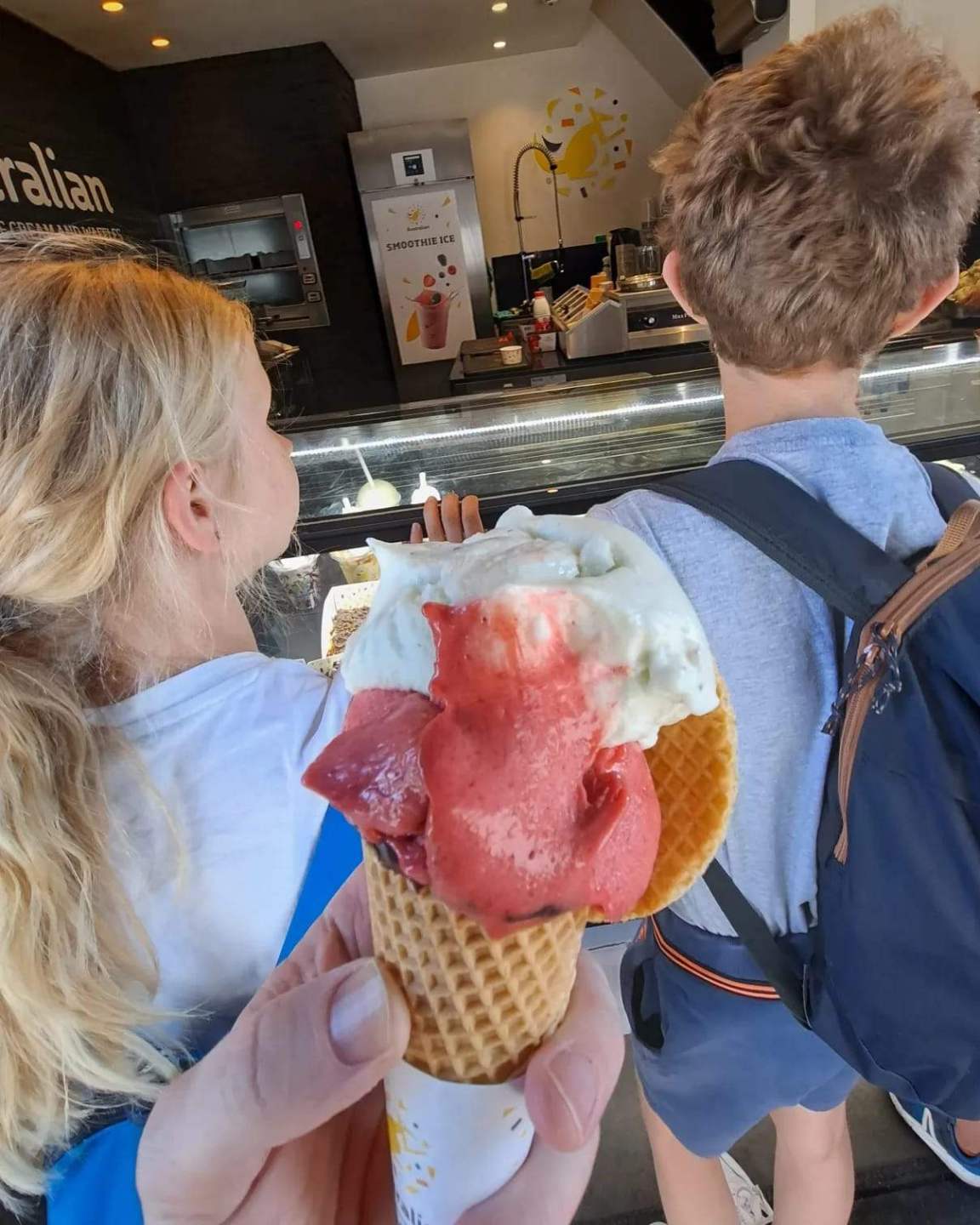 Terug 350 meter naar de wafelverkoopster in de Veldstraat, die ook ijsjes verkoopt. Nog eens 25 minuten pauze om onze (gigantische) bollen ijs op te eten.